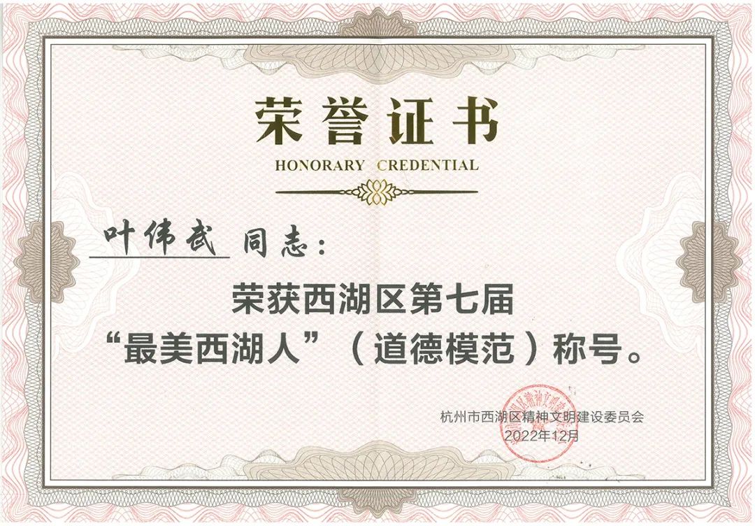 董事長(cháng)葉偉武榮獲西湖區第七屆“最美西湖人”(道德模范)稱(chēng)號