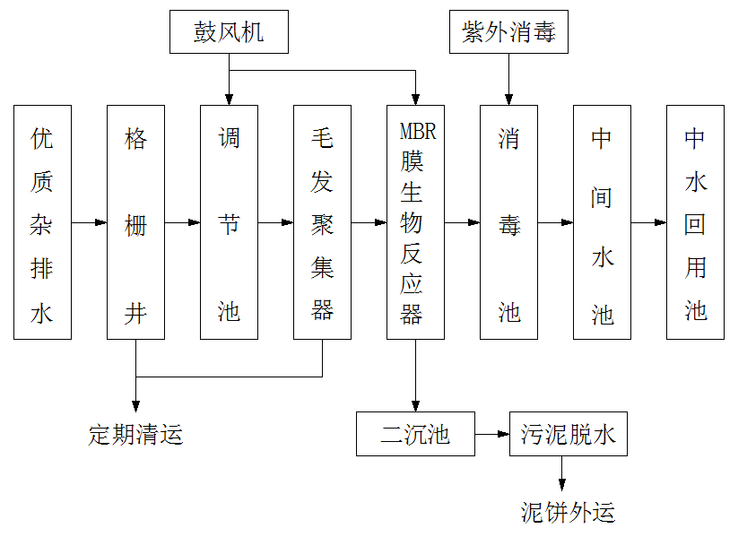 本項目為商業(yè)中心中水回用項目,回用水用于沖廁。中水的來(lái)源為洗滌,沐浴,廚房等優(yōu)質(zhì)雜排水,根據進(jìn)水水質(zhì)分析,優(yōu)質(zhì)雜排水可生化性好,宜采用生化處理。同時(shí),因業(yè)主提供的處理設備安放場(chǎng)地有限,因此可選擇占地面積較小的生化處理結合膜生物反應器工藝,故確定處理工藝為:格柵→調節池→生化處理→膜處理→消毒→回用。