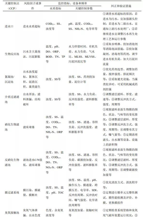 《水回用導則 再生水廠(chǎng)水質(zhì)管理》首次將HACCP體系引入再生水廠(chǎng)水質(zhì)管理。針對再生水廠(chǎng)水源水質(zhì)復雜多變、處理環(huán)節長(cháng)等特點(diǎn),為滿(mǎn)足再生水水質(zhì)安全保障需求,再生水廠(chǎng)應根據水源特點(diǎn)、處理工藝和水質(zhì)管理目標,基于風(fēng)險分析與關(guān)鍵控制點(diǎn)(HACCP)體系,制定再生水廠(chǎng)水質(zhì)管理措施。水質(zhì)管理措施包括風(fēng)險識別、CCP設置和管理、水質(zhì)異常應對措施、可持續改進(jìn)、應急管理等方面,其制定流程如圖2所示。再生水廠(chǎng)的潛在風(fēng)險、CCP監控指標及水質(zhì)異常應對措施示例如表1所示。當CCP的水質(zhì)指標和控制參數超出目標范圍時(shí),應及時(shí)采取應對措施,使其盡快恢復正常運行狀態(tài)。