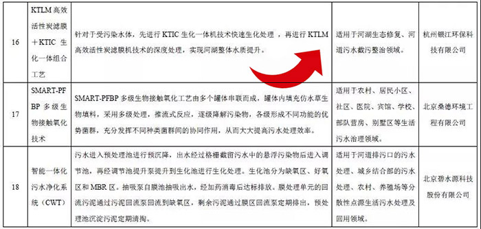 技術(shù)目錄顯示,來(lái)自北控水務(wù)的城鎮排水系統智慧運營(yíng)管控平臺,北排集團城市污水好氧高密度微生物顆粒技術(shù)和基于厭氧氨氧化功能菌群優(yōu)化的污水處理新技術(shù),桑德環(huán)境的SMART-PFBP 多級生物接觸氧化技術(shù),碧水源的“MBR-DF”雙膜技術(shù)和智能一體化污水凈化系統(CWT),銀江環(huán)保的KtLM+KtIC一體化組合工藝等21項水污染防治技術(shù)位列其中。