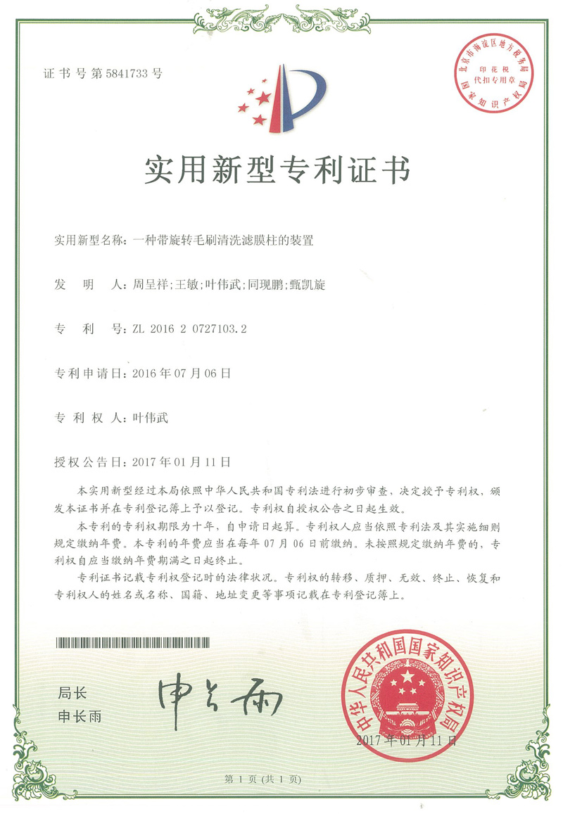 一種帶旋轉毛刷清洗濾膜柱的裝置